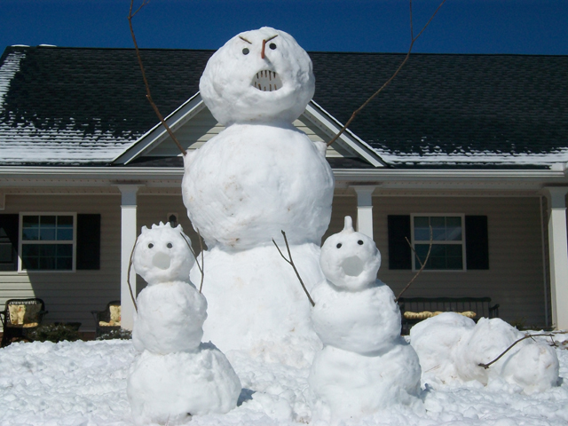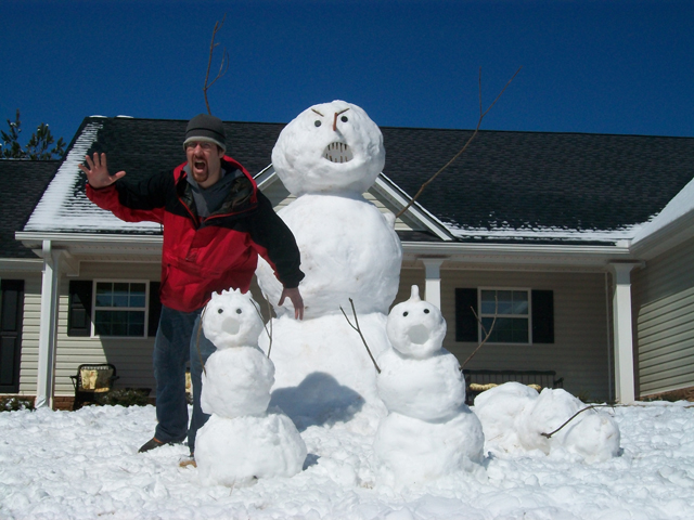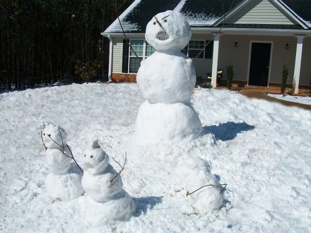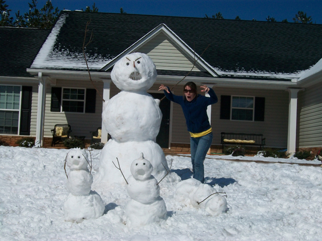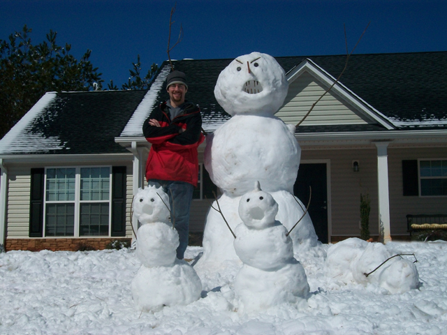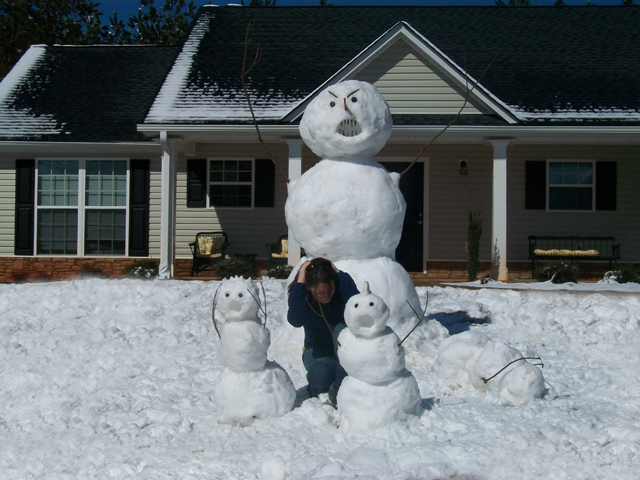 Yesterday we got about 5″ of snow! Not too common in Georgia, but it was the second year in a row that we got a lot of snow. So, Kati and I spent the morning trying to beat our snowman last year… and one-up our neighbors this year. I think we won :).